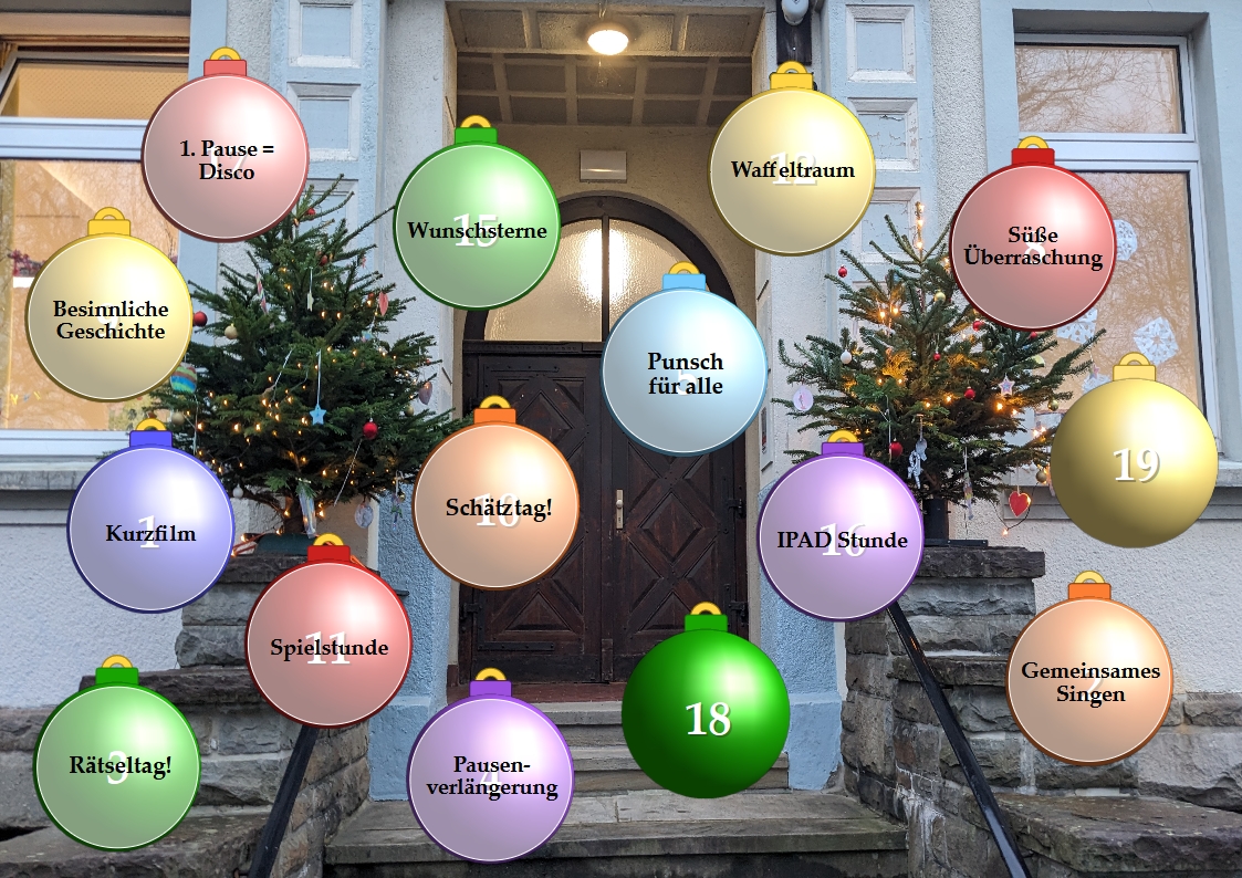 Auch in diesem Jahr halten wir mit unserem Adventskalender wieder an jedem Schultag im Dezember eine kleine Überraschung für unsere Schülerinnen und Schüler bereit.